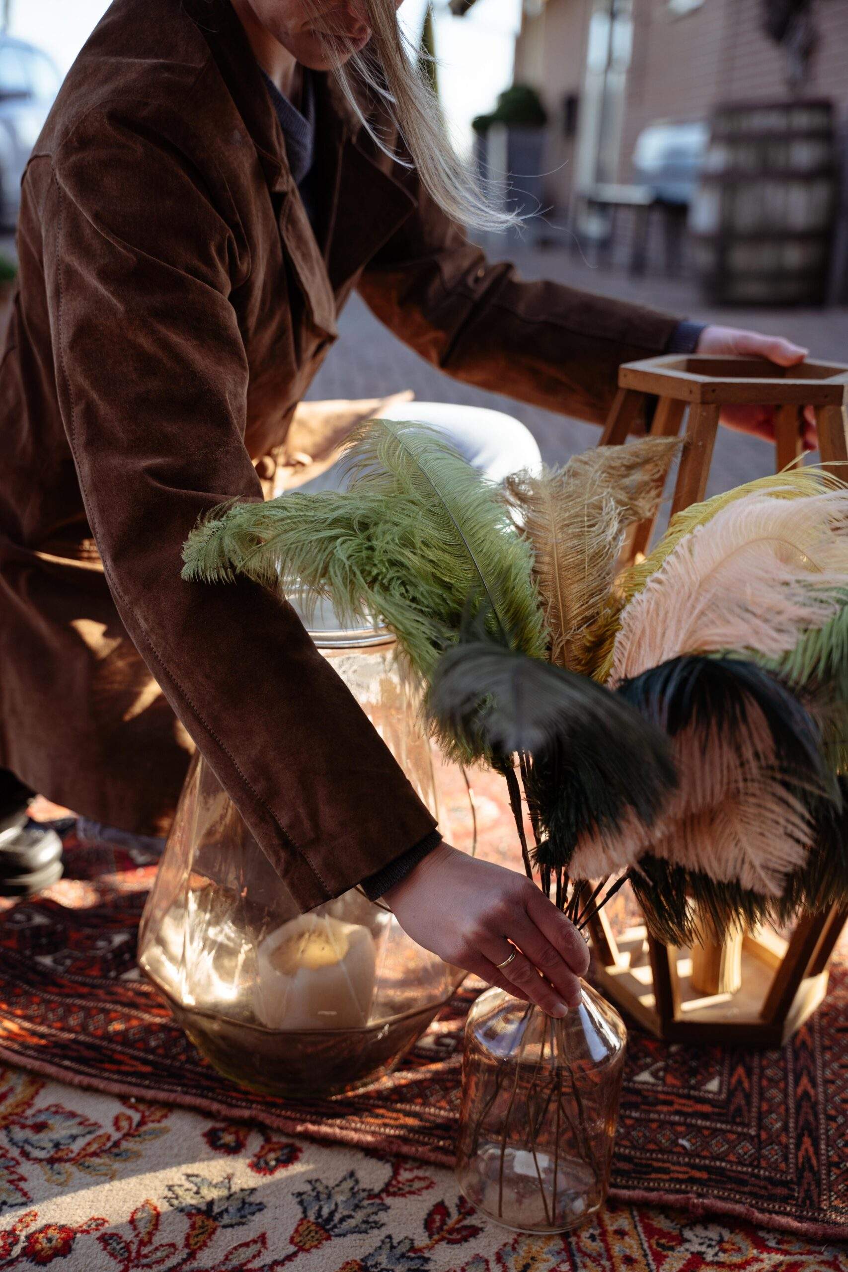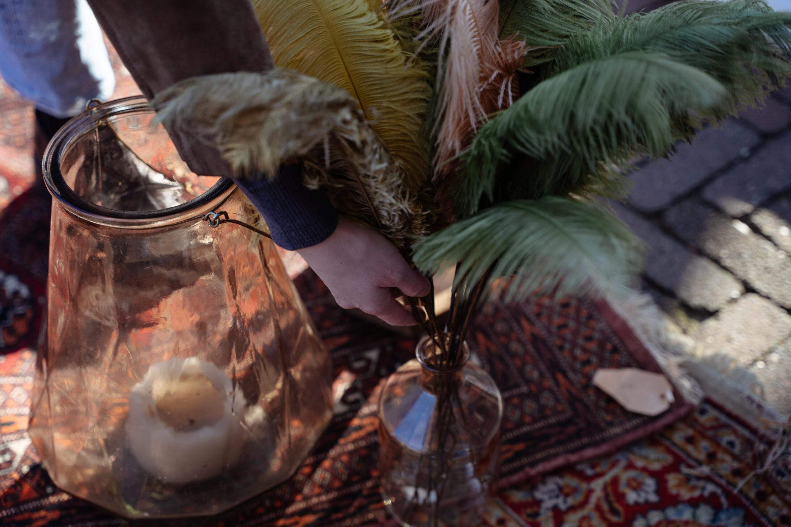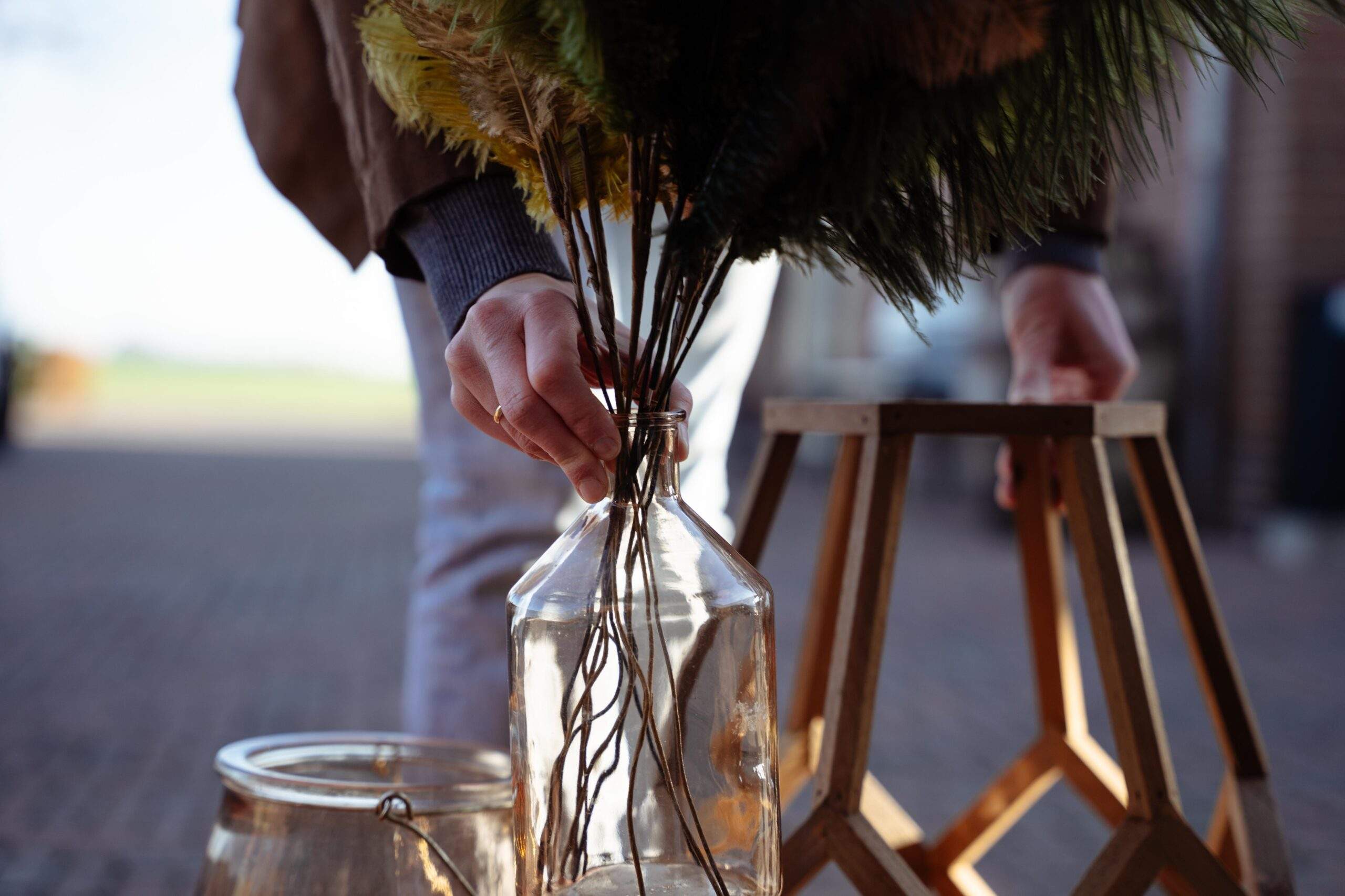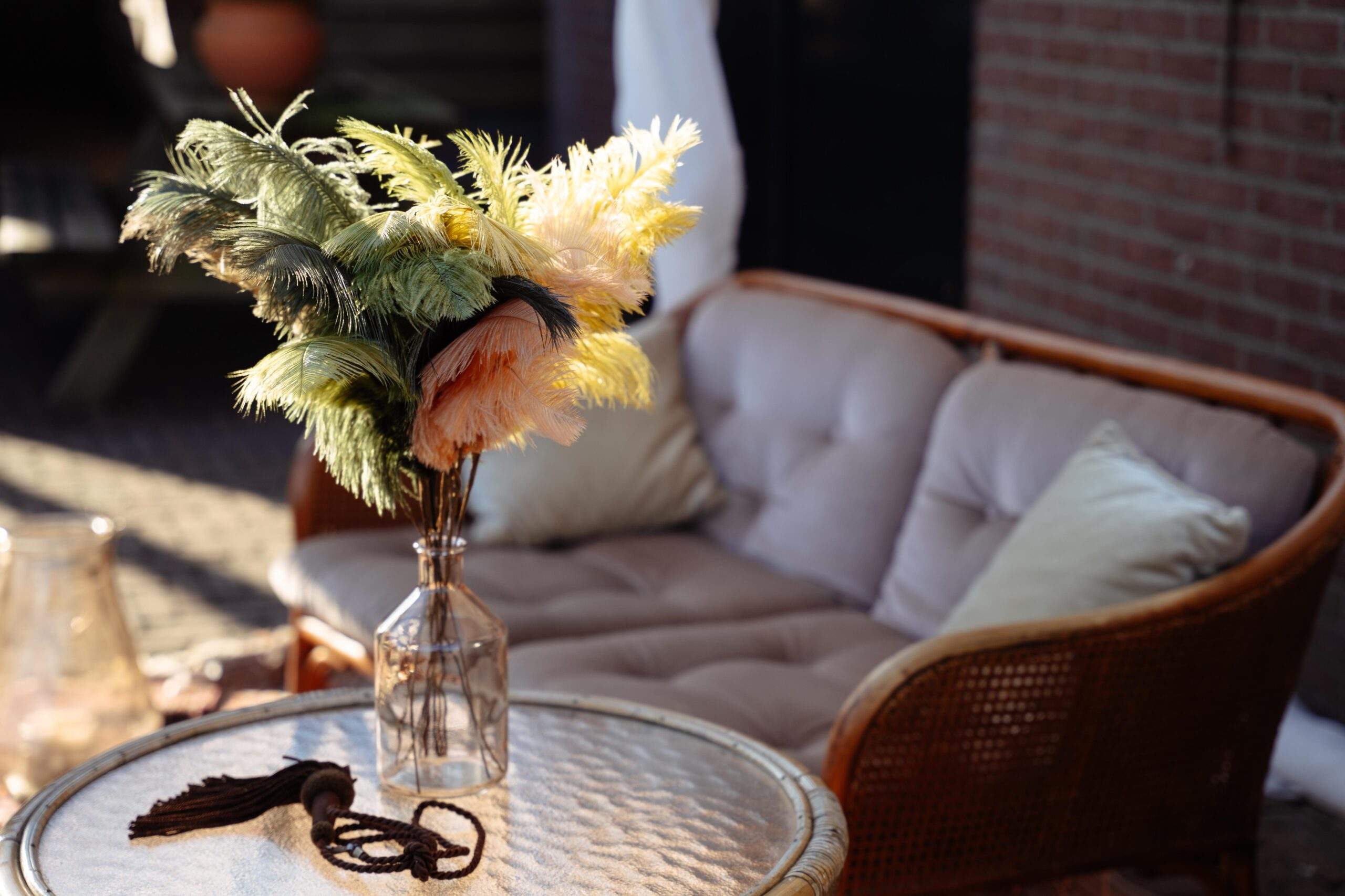 Leuke tafel decoratie voor je bruiloft. Veren of pluimen in vaas. Diversen kleuren